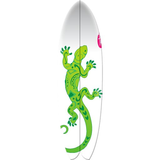 Une planche de surf "Fish" originale. Le motif "Gekko" est plaqué à même le produit, pour une tenue optimale.